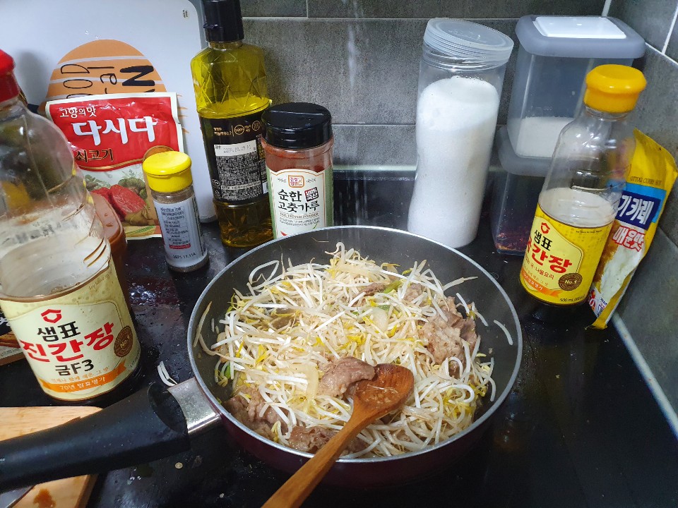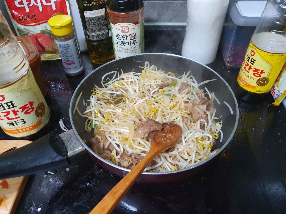 8. 씻어놓은 숙주를 넣고 볶아주세요!
