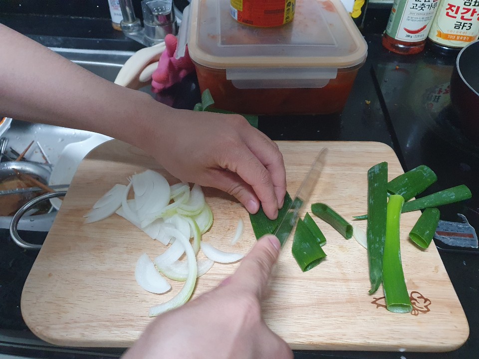 물이 끓는다면 준비된 김치와 다진마늘 한큰술을 넣어줍니다!