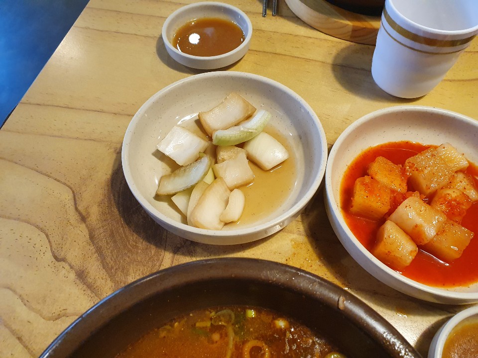 밑반찬은 깍두기, 배추김치, 양파절임
