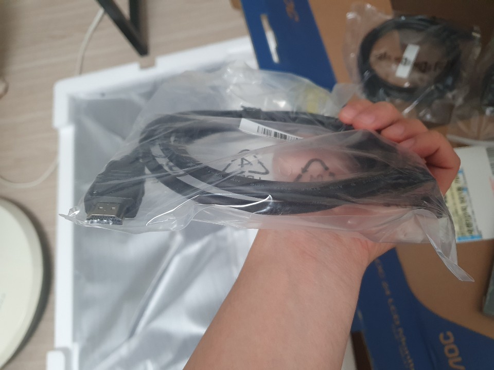 구성은 본체, 거치대, HDMI케이블, DP케이블,