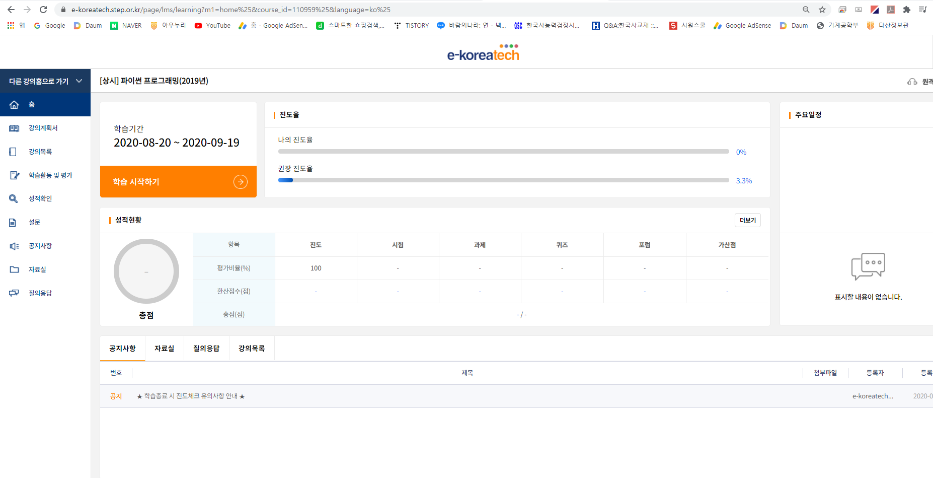 이곳에서 나의 진도율, 권장 진도율 등을