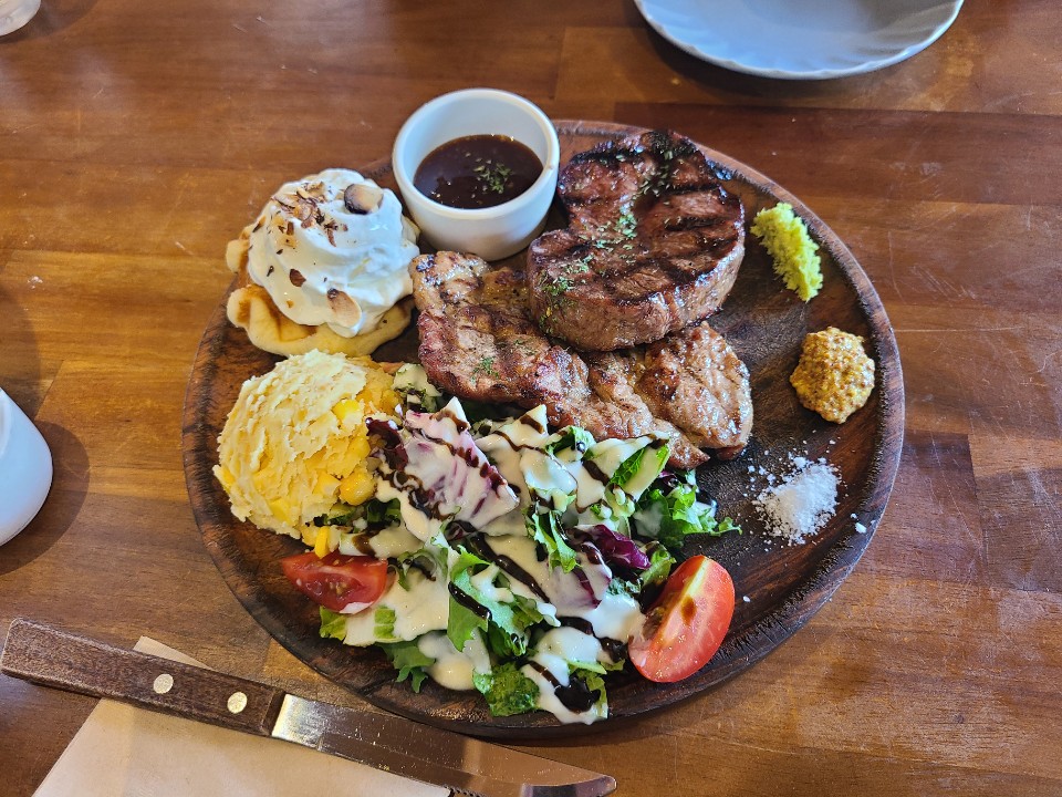 미니 와플, 콘감자 샐러드, 샐러드, 고기가