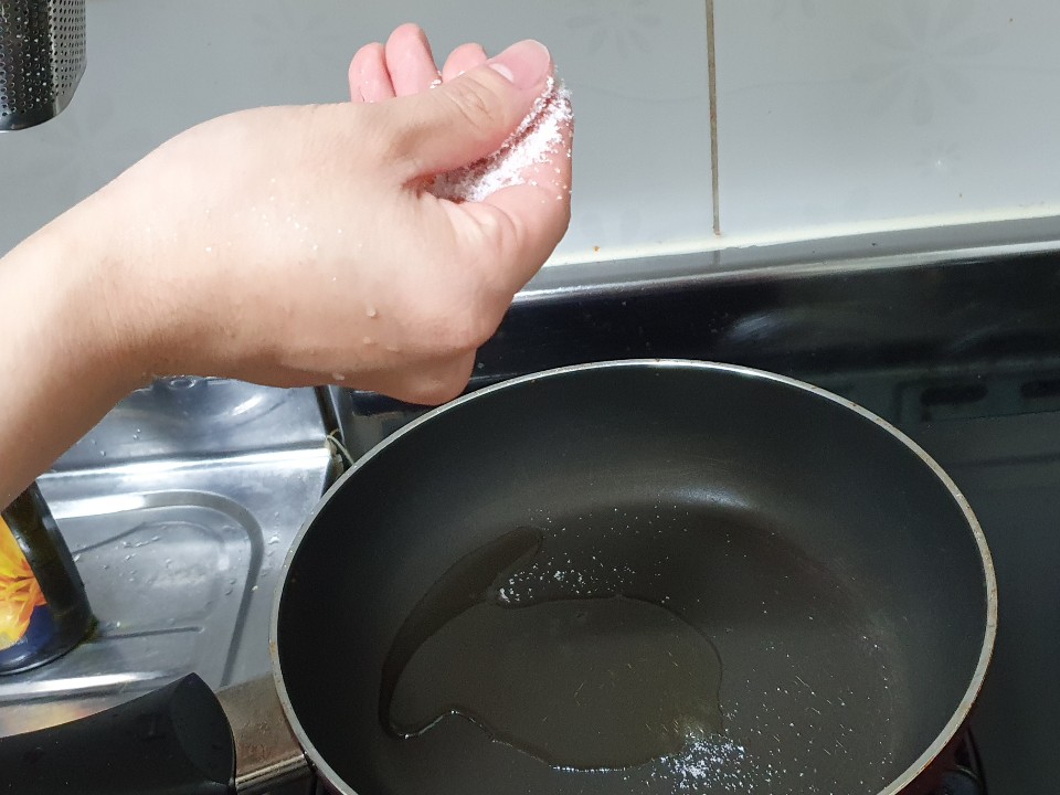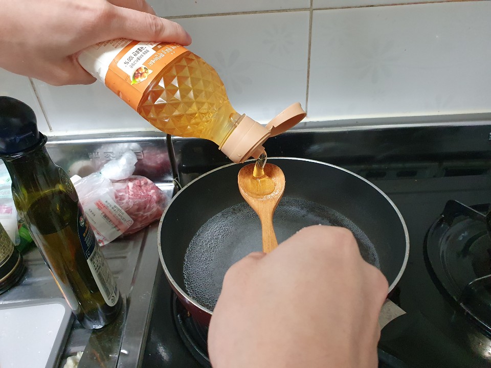 새로운 팬에 식용유 2큰술