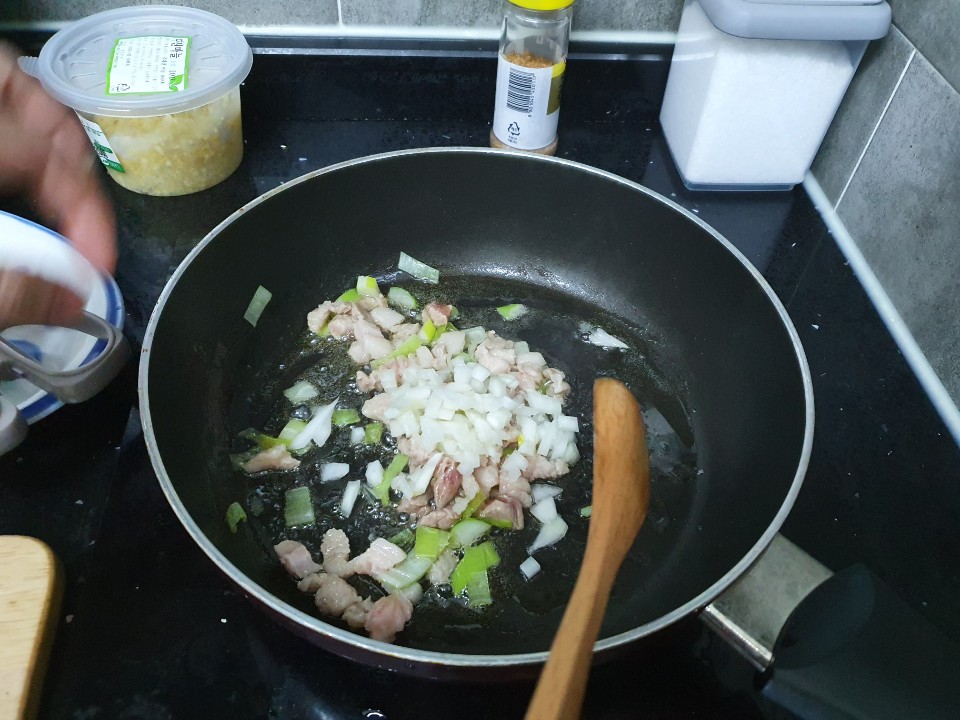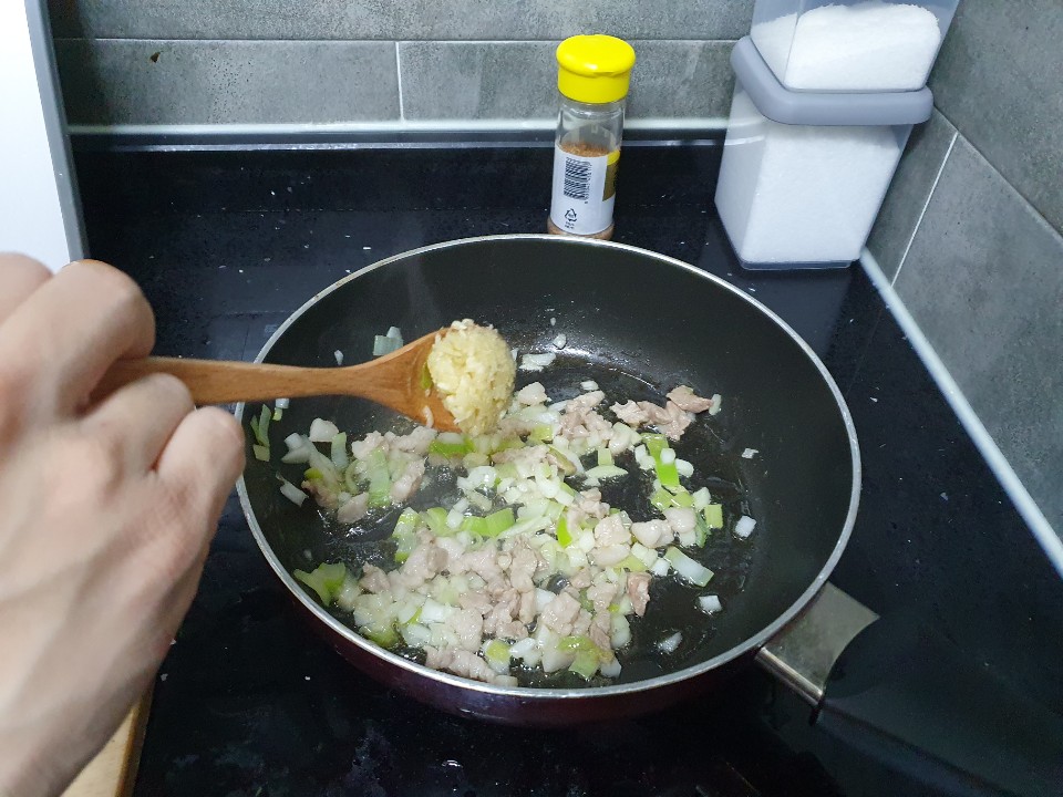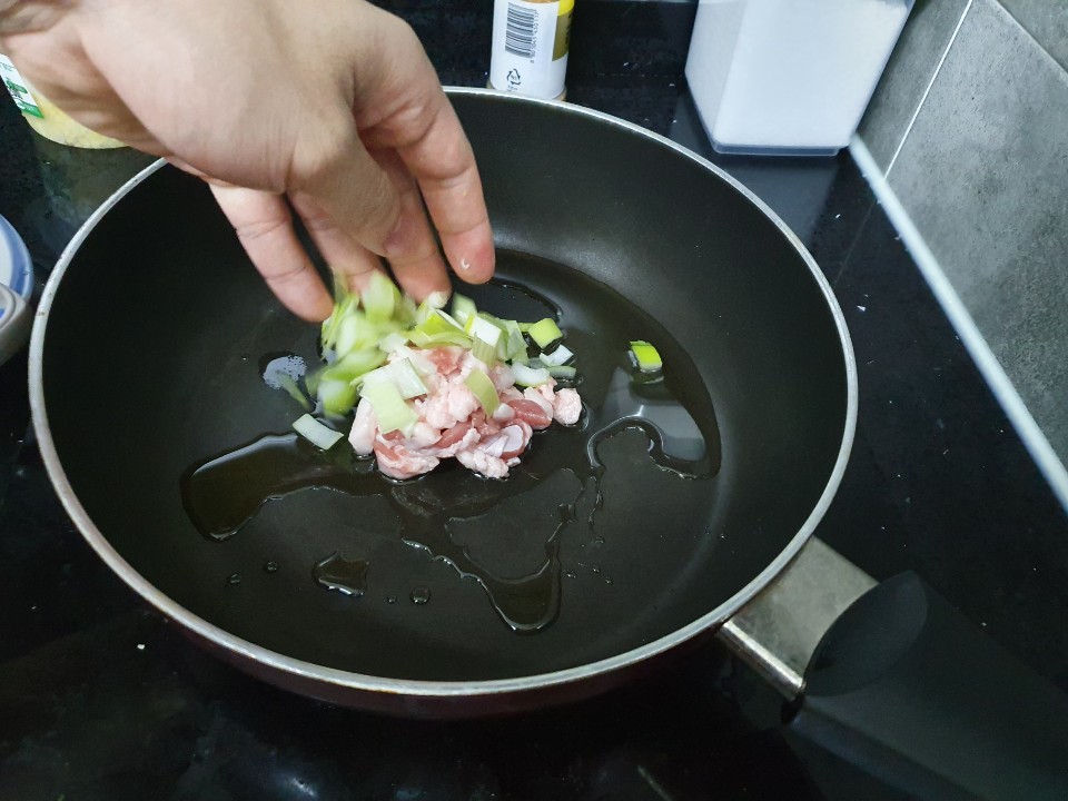 다진고기, 대파를 넣고 달달