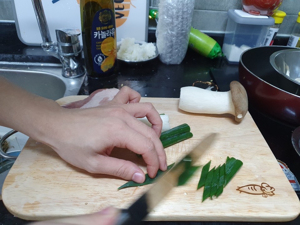 초록색 부분 일부를 길쭉하게 썰고있어요~