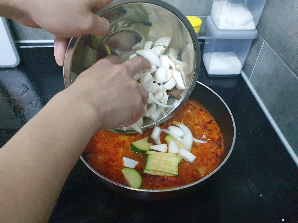 감자가 익으면 애호박, 버섯, 양파를
