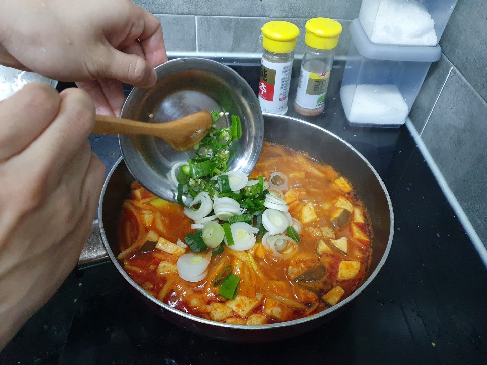 마무리 홍고추, 대파 고명을