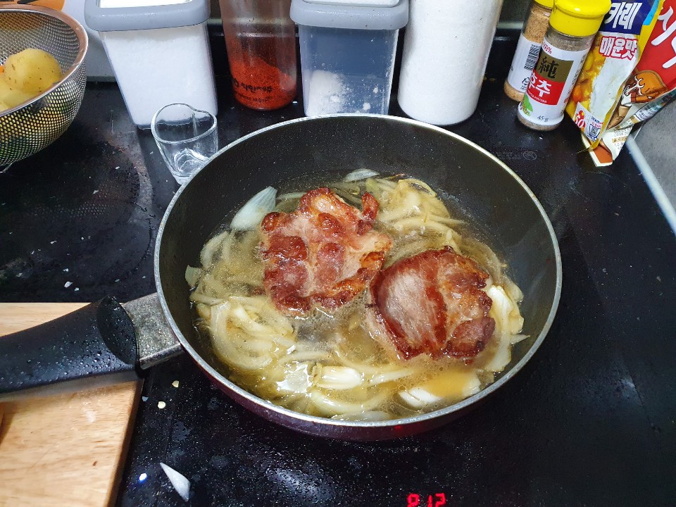 목살과 양파가 적당히 잠길 때 가지 부어주세요~