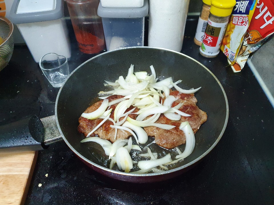 9. 채썰어둔 양파를 넣어주시고 숨이 죽을때 까지