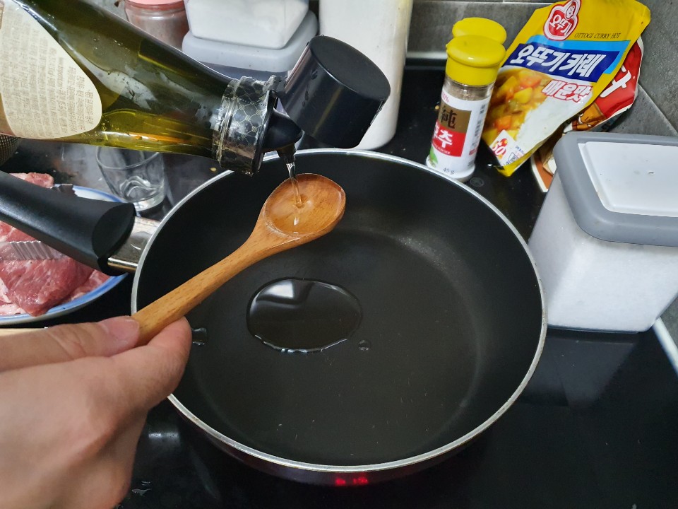 6. 식용유 2큰술을 팬에 넣고 달궈주세요!