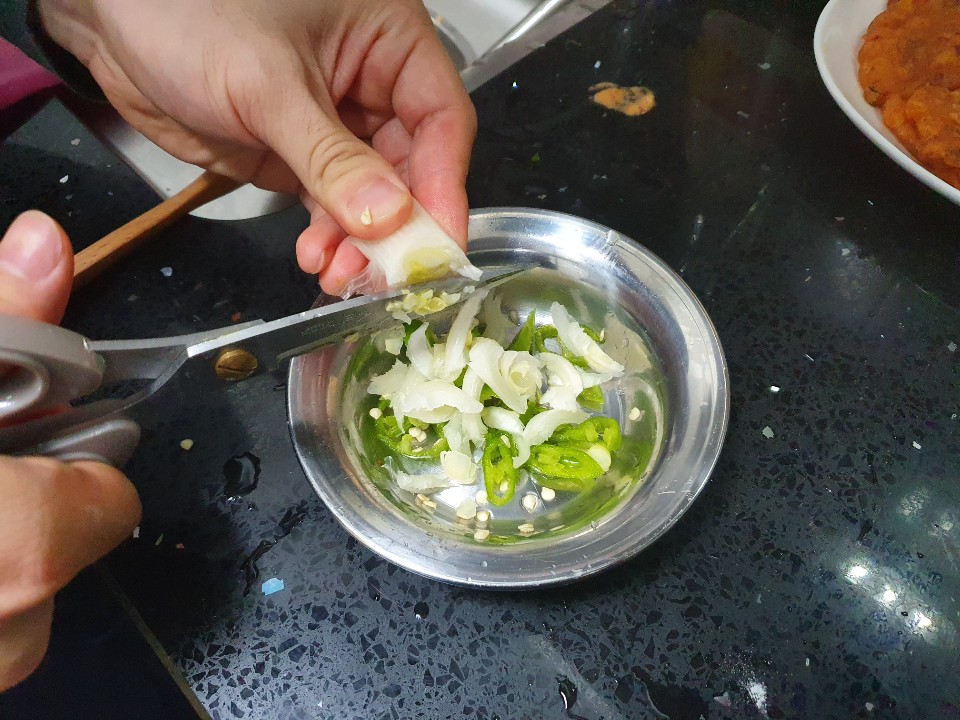1. 청양고추를 가위로 잘게 잘라주세요!