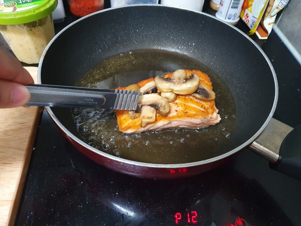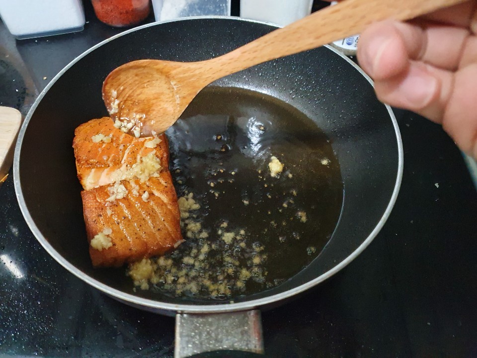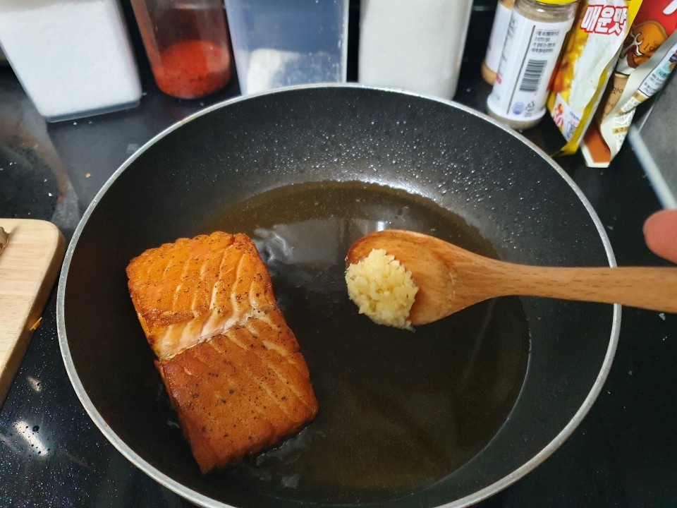 10. 연어가 거의 다 익었다면 다진마늘 반큰술을 넣고