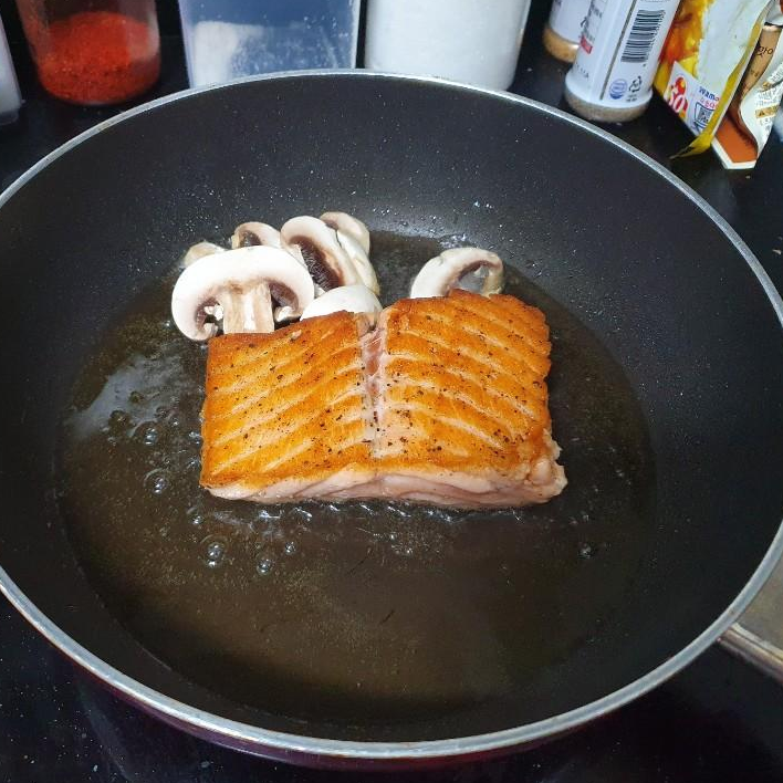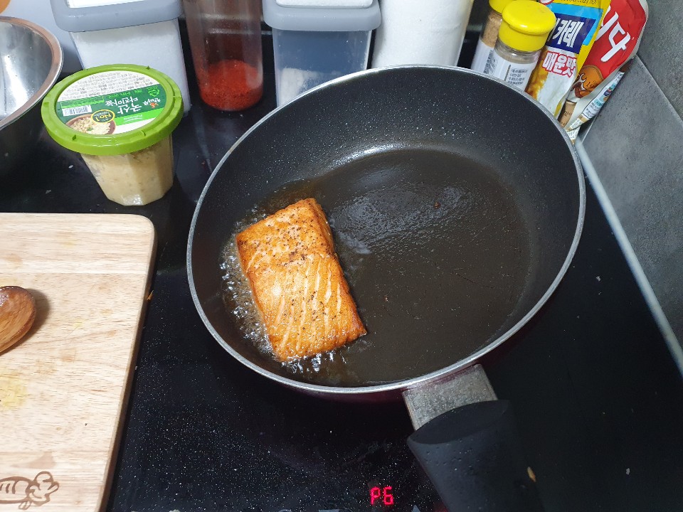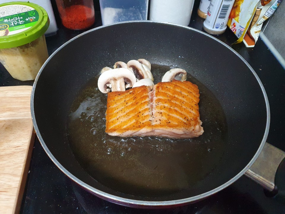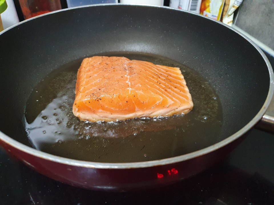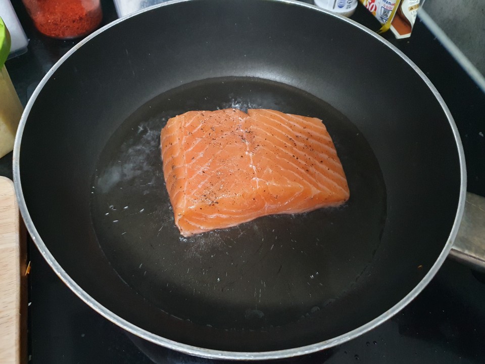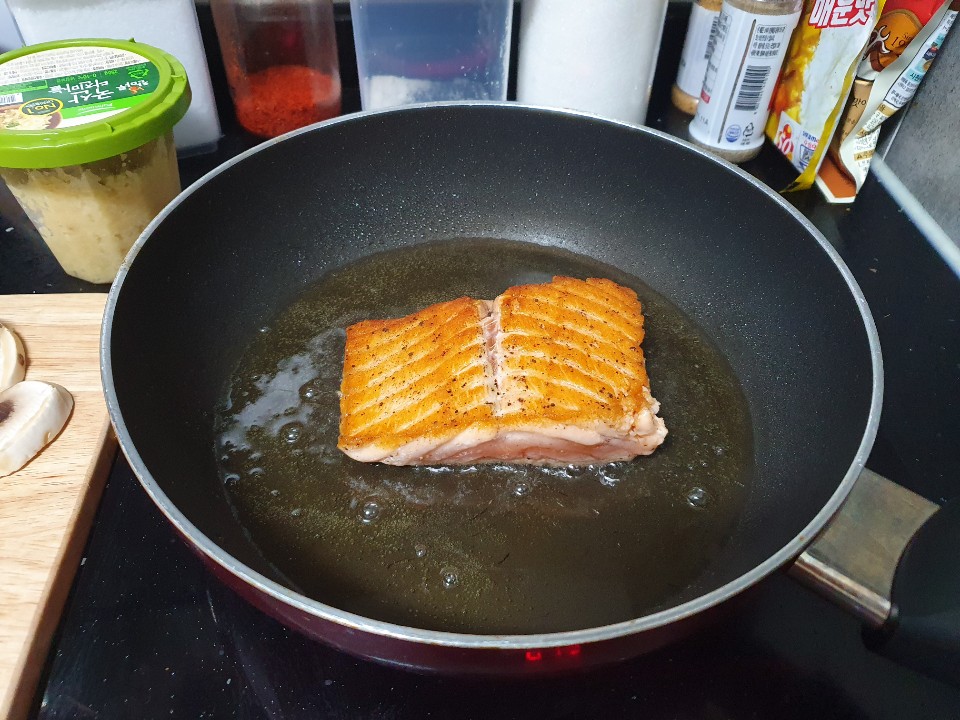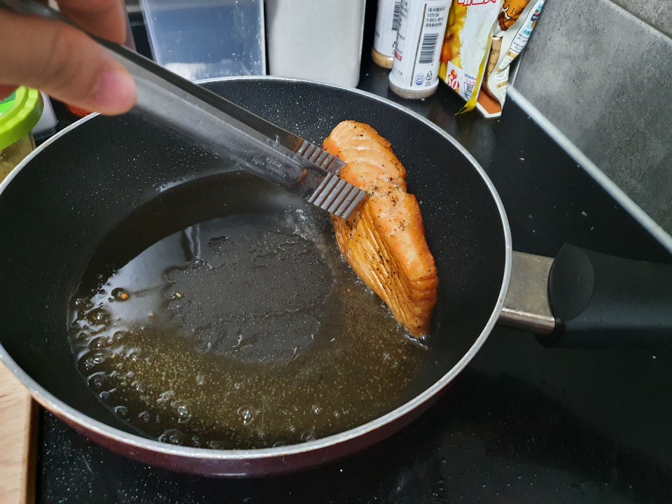 6. 예열된 기름에 연어를 구워주세요!