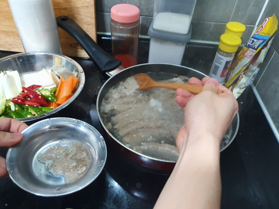 위에 올라온 거품들을 수저를 이용해서 거둬내주세요