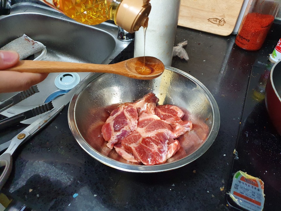 준비된 고기에 진간장 한큰술을 넣어주세요!