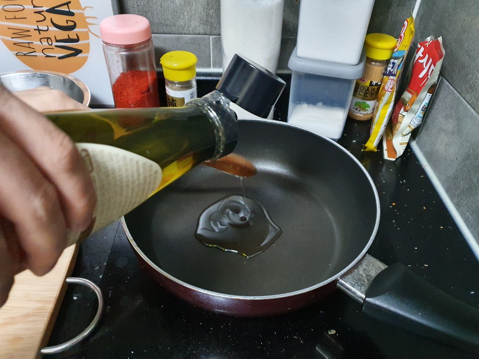 기름 두큰술을 팬에 두르고 충분히 달궈주세요