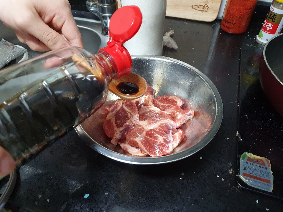 준비된 고기에 진간장 한큰술을 넣어주세요!