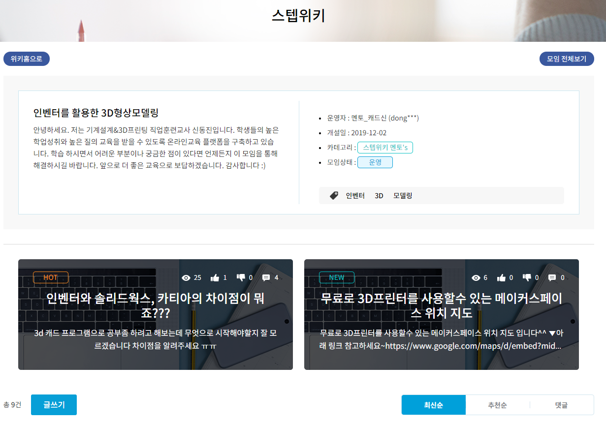 모임 맨 왼쪽 스텝위키 맨토's 목록의 인벤터관련 모임을 클릭해볼게요!