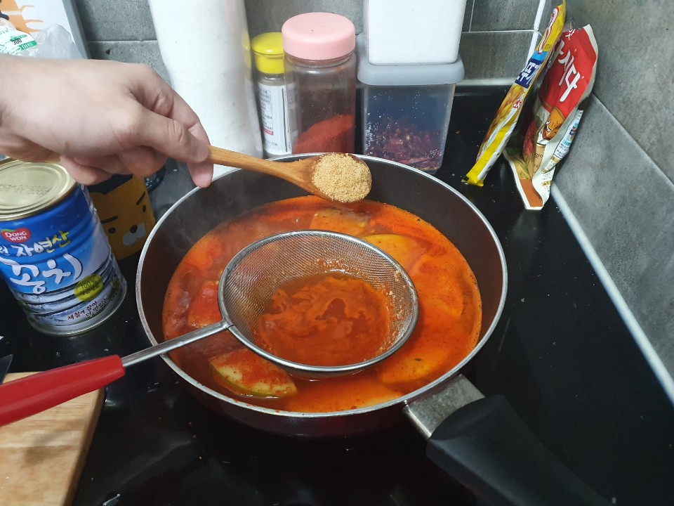 된장을 1큰술을 잘 풀어주시고, 고춧가루 4큰술을 넣어주세요!