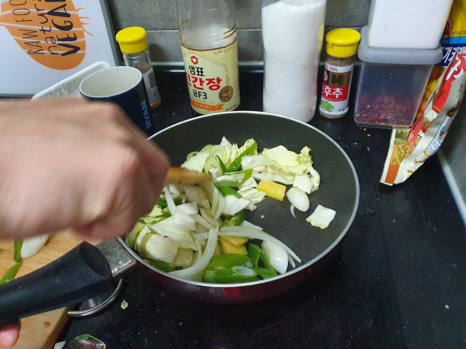 준비해둔 야채를 한움큼 집어 볶아주세요!