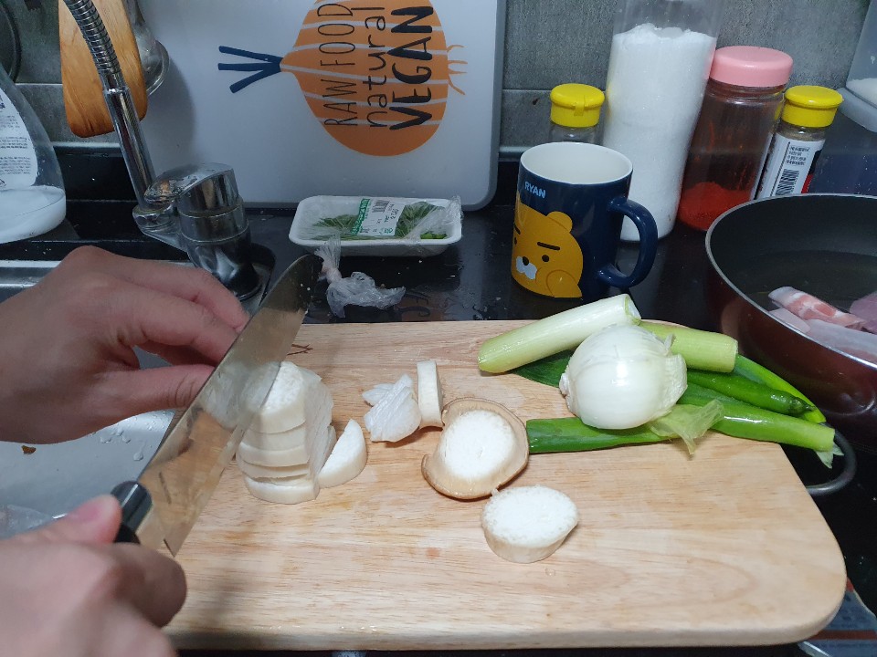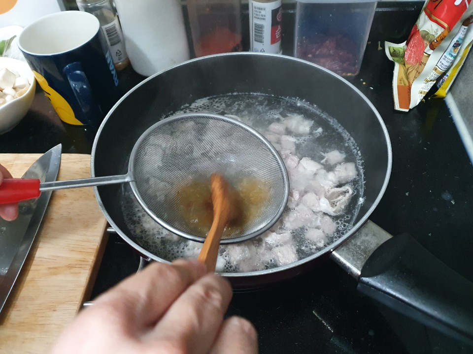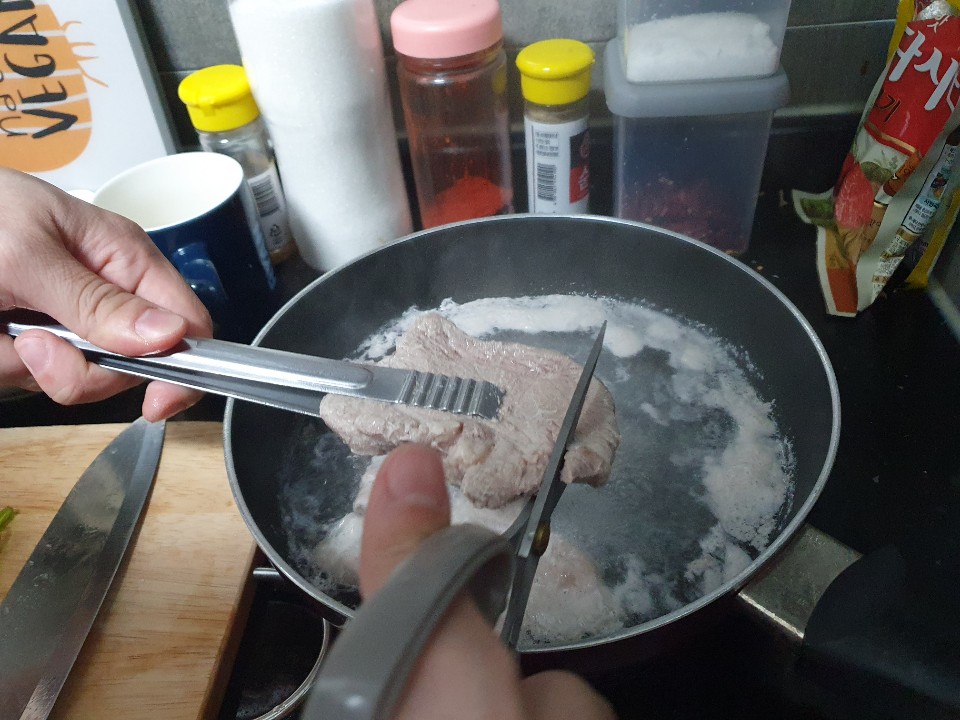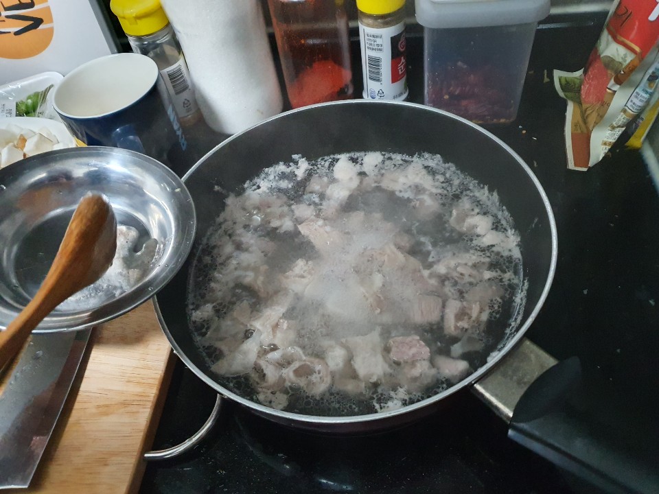 재료를 준비하는 동안 고기를 먼저 삶아주세요